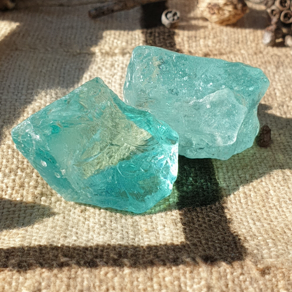 Intended to be worked with as a duo, these Andaras offer unique insights when meditated upon, with the seafoam variant in the left (receiving) hand and the clear aqua in the right hand. In this union, the Seafoam imparts grounded knowledge and wisdom, while the clear Aqua Andara envelops you in gentle, tranquil water energy, reminiscent of a peaceful wave lapping at the shore.